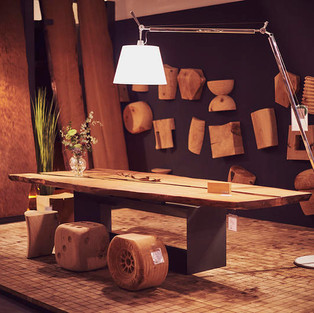 The exhibition includes the classics in solid walnut and oak, next to the pieces in Briccola, millennial Kauri and fragrant cedar.